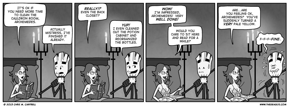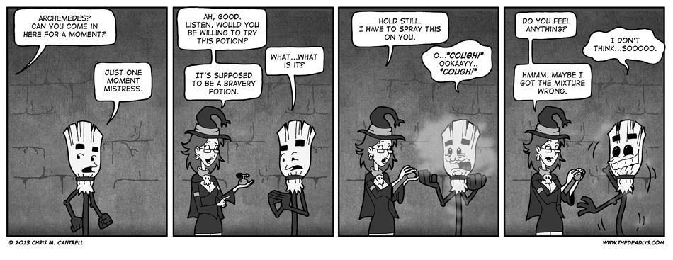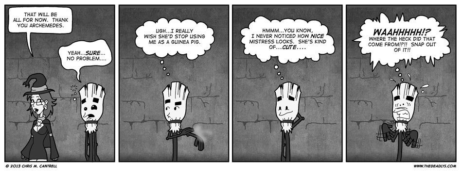 Autumn’s assistant Archemedes is a guinea pig for her latest potion. Unfortunately for her, the potion turns him into a raving madman who’s head over heels in love with her!